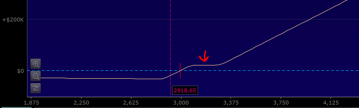 The downside limit (same correlation assumption) — at expiration — is approximately -$40k, regardless of whether the S&P 500 is down 10% (which would amount to a -$80k+ hit were this portfolio not hedged) or a 2008-style down 50% (would be a -$400k+ hit, un-hedged) come expiration.