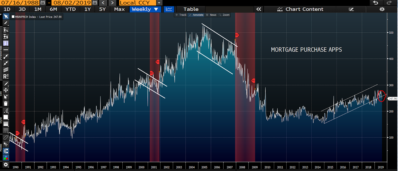 Mortgage Purchase Apps: red shaded areas represent past recessions…
