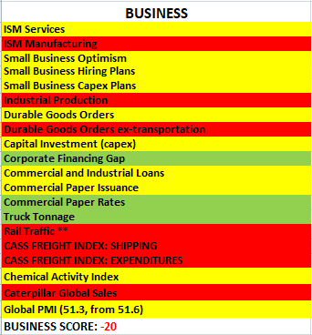 As we reported; same store sales, homebuilder sentiment, housing starts and permits all scored above expectations. However, industrial production (down year-on-year), the Empire State Manufacturing Survey (plunging outlook), and today’s release of the widely-followed Duke University CFO survey (general optimism and capex rolling over) paint anything but a rosy picture.